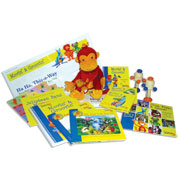 Home Materials: Two Books—Can You Catch Me? and Put Your Left Paw In, Two Home CDs, Family Guide, Rascal the monkey hand puppet and finger puppet, and two monkey den-den drums.
